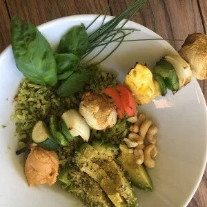 Assemble the bowls: Grab a bowl and fill the bottom with the warm broccoli or cauliflower, top with kabob, avocado, a dollop of hummus, handful of nuts, seeds and any chopped herbs you have in the house. If you are feeling it, you can sprinkle turmeric on top for bonus points, a squeeze some lemon.